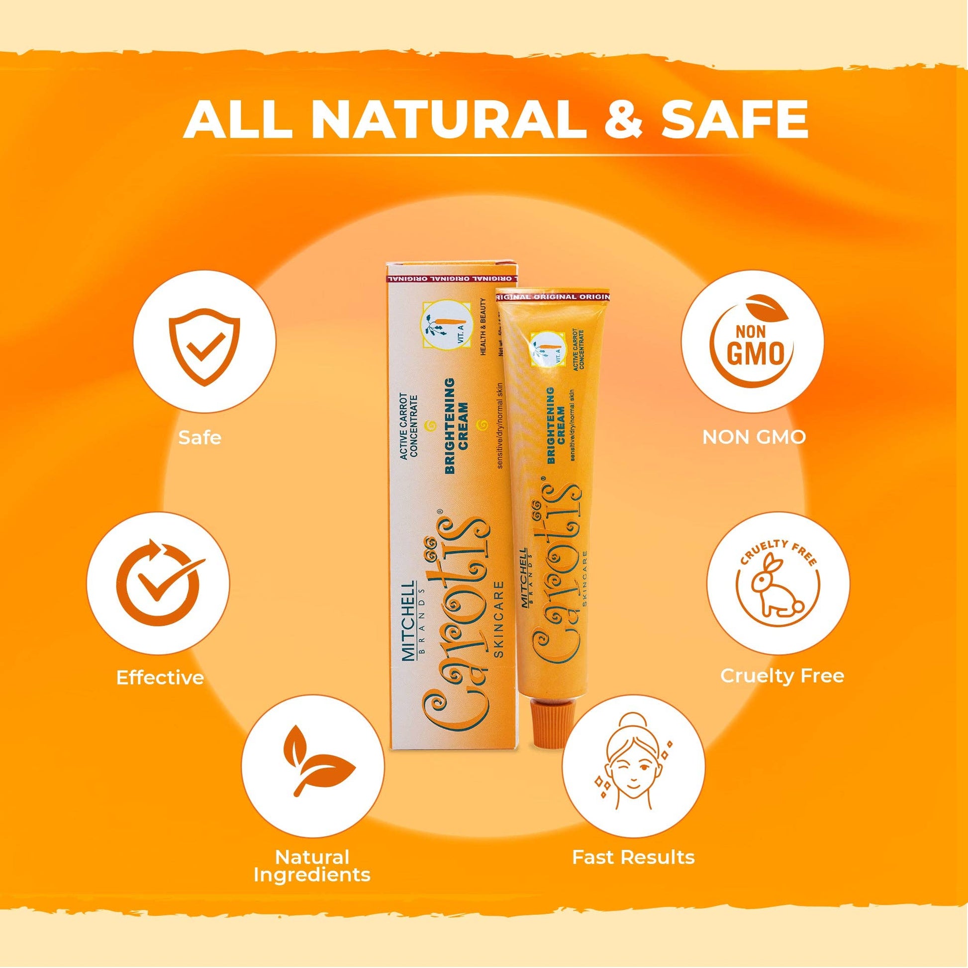The Carotis Brightening Cream is a safe and effective cream rich in natural ingredients like Carrot Oil, Shea Butter, Alpha Arbutin, and Vitamin A.