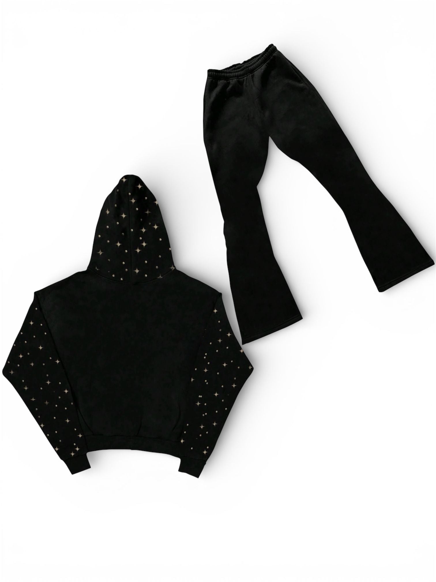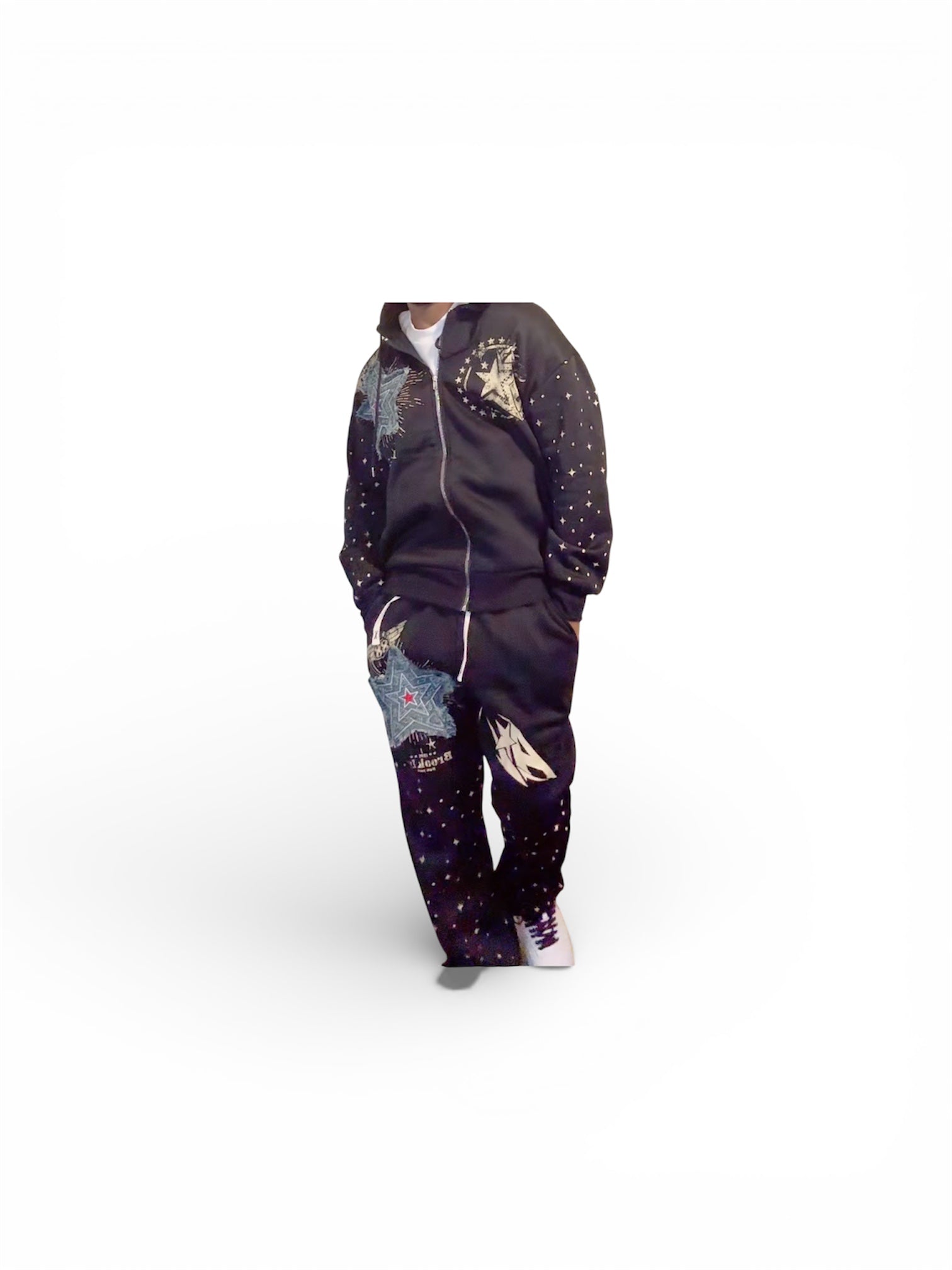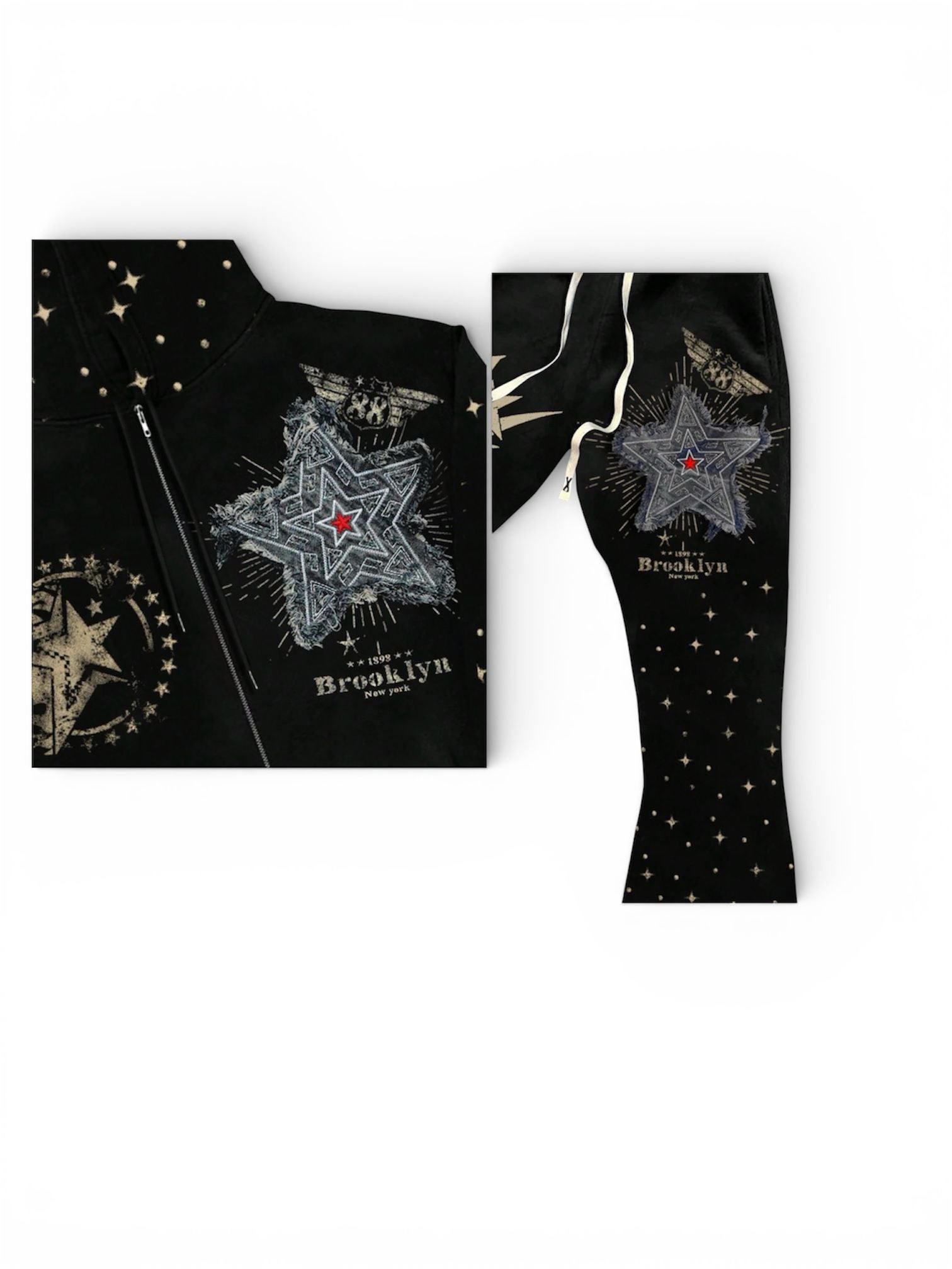 A black zip-up hoodie with an all-over small star pattern. It features bold graphic star designs on the chest, including one large star with detailed artwork and a smaller red star in the center. Black jogger-style pants that match the hoodie, also covered with small star prints.