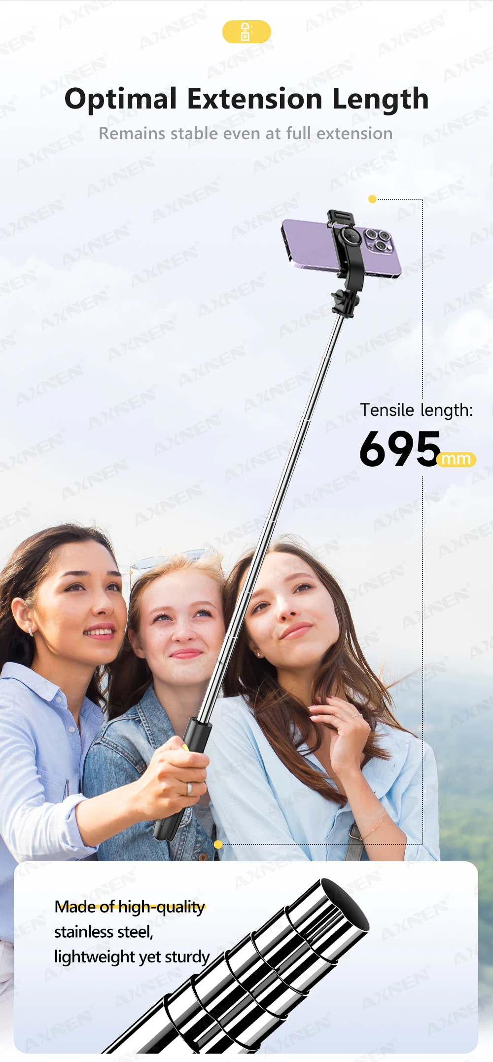 This selfie stick also serves as a tripod, providing stability with its stainless steel pole. Perfect for various photo needs. Fill Light available in upgraded version for improved photo and video quality in low light.