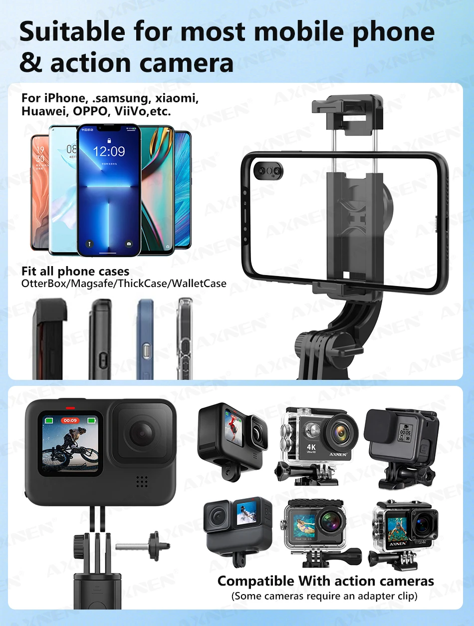 Works with most smartphones and iOS 5.0/Android 4.2.2 or higher. Connect via Bluetooth and shoot, no extra app needed. Compatible with most camera apps.